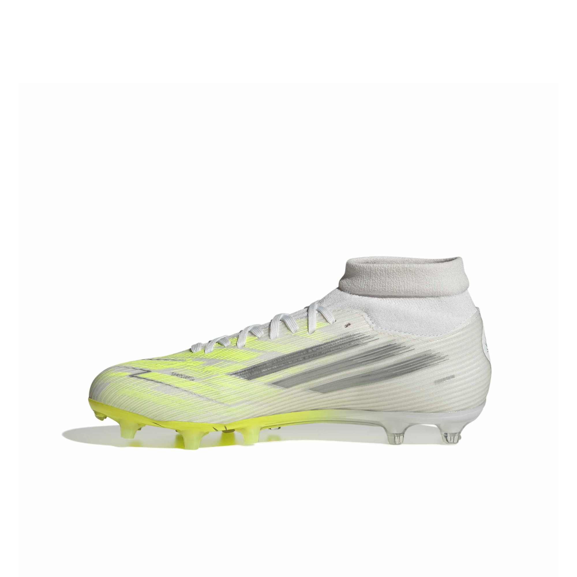 Football boots with Sprintplate Fusion outsole for traction on firm ground. Designed for players who dare to change the game, the adidas F50 Sparkfusion League Mid-Cut Football Boots deliver a balance of comfort, stability, and performance. The mid-cut knit collar moulds to your foot, providing a snug, second-skin fit for confident movement. Fusionlast technology optimises the instep, heel, and toe box to enhance comfort and support throughout play. The synthetic and textile upper offers durability with a lightweight feel, while the Sprintplate Fusion outsole delivers reliable traction for quick rotations and explosive push-offs on both natural and artificial grass surfaces. These boots help keep your feet secure during every sprint, dribble, and tackle so you can perform at your best on the pitch.