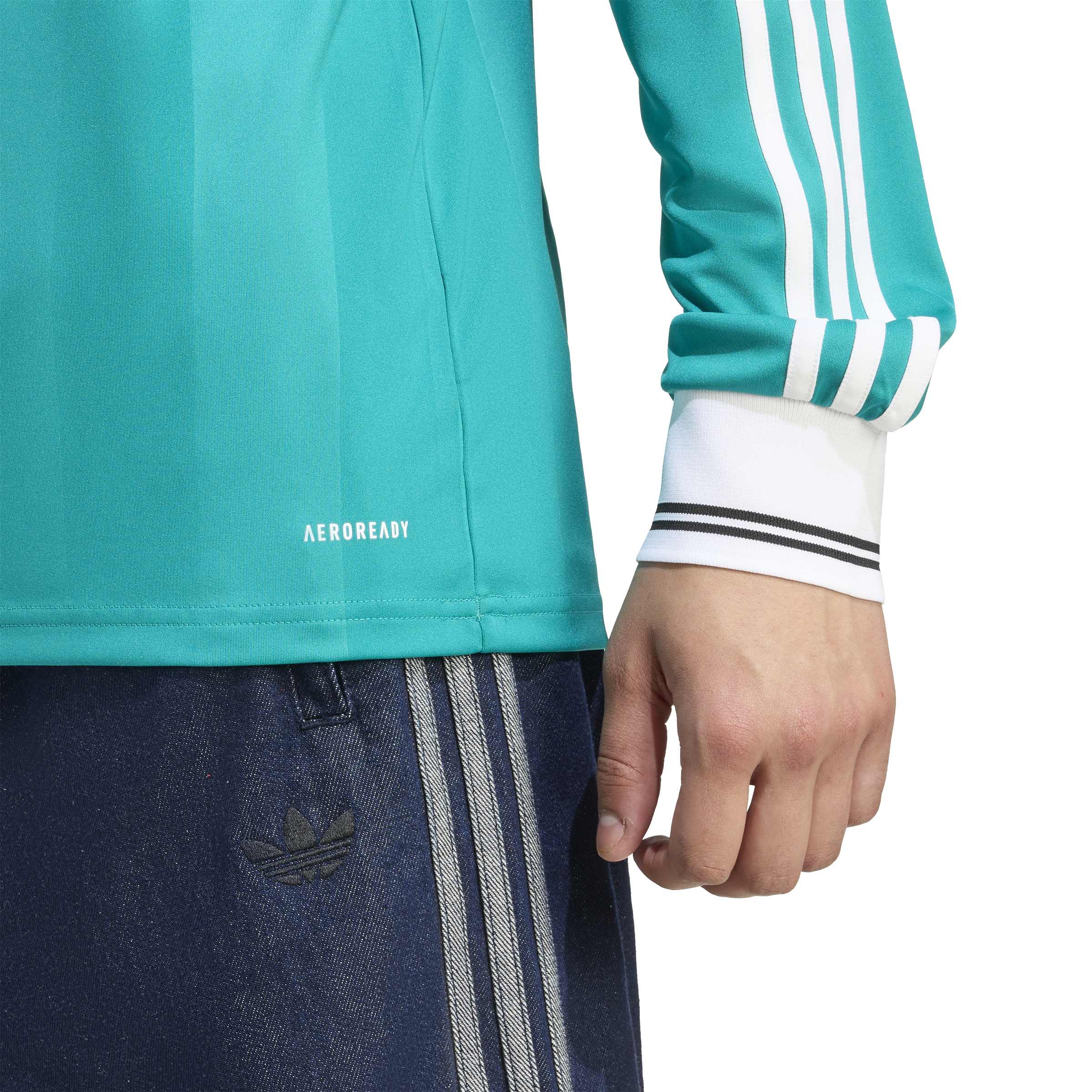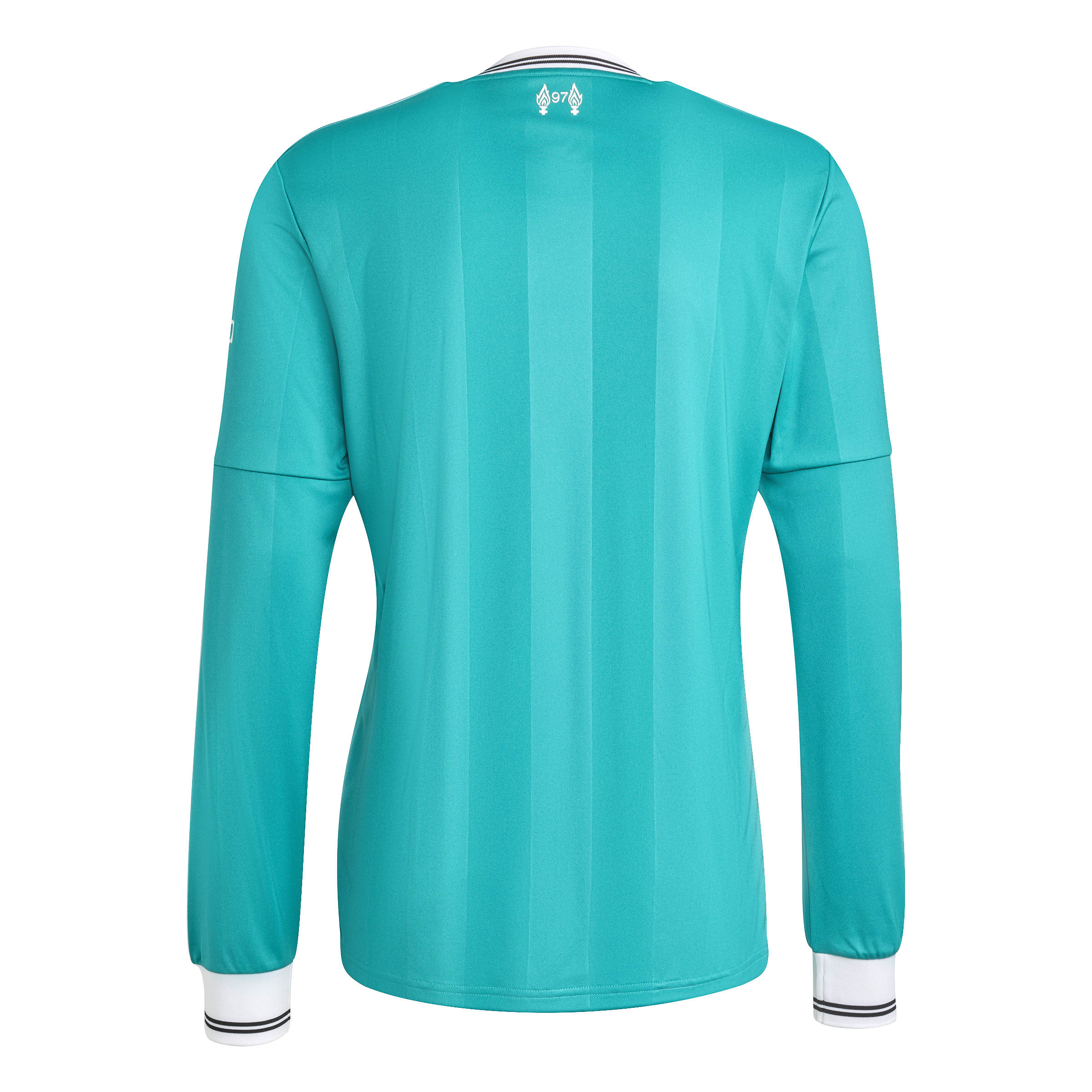 A modern soccer classic inspired by Liverpool FC's storied 3-Stripes history. The tonal vertical stripes on this third jersey come in unmistakable adidas Equipment green. On the chest, that vintage club badge shares the spotlight with a Trefoil for the first time since 1991. Created for traveling Reds, this long sleeve shirt includes moisture-managing AEROREADY so it feels as good as it looks.